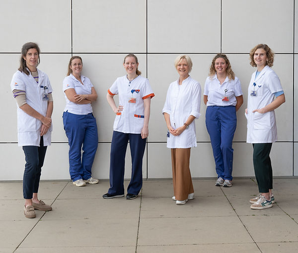 Van links naar rechts: dr. Ann-Sophie De Paepe, Justien Vannieuwenhuyse, Jessie Everaert, dr. Lieve Delsupehe, Liese Bostyn, dr. Maaike Rathé.